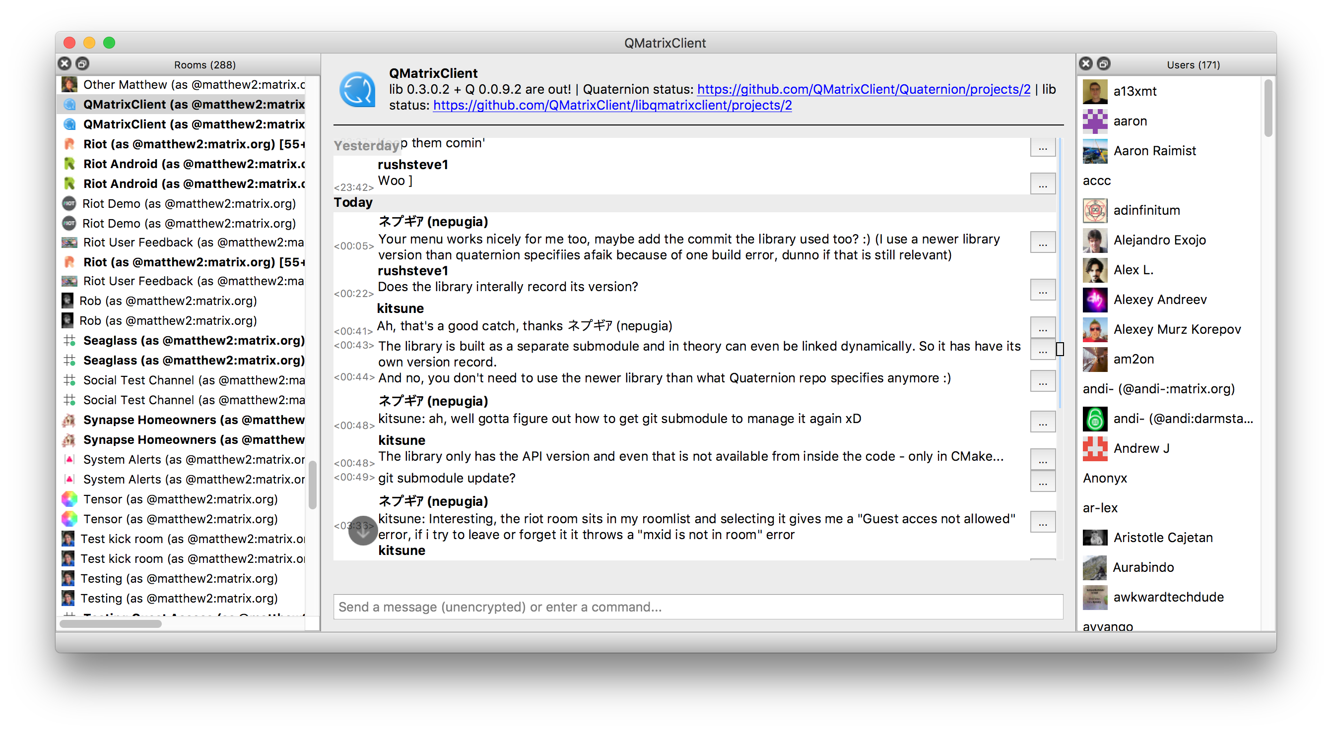 libQMatrixClient 0.3.0.2 has been released - no new features, just small fixes including one for an unlucky typo preventing 0.3.0.1 from generating .cpp files with GTAD.