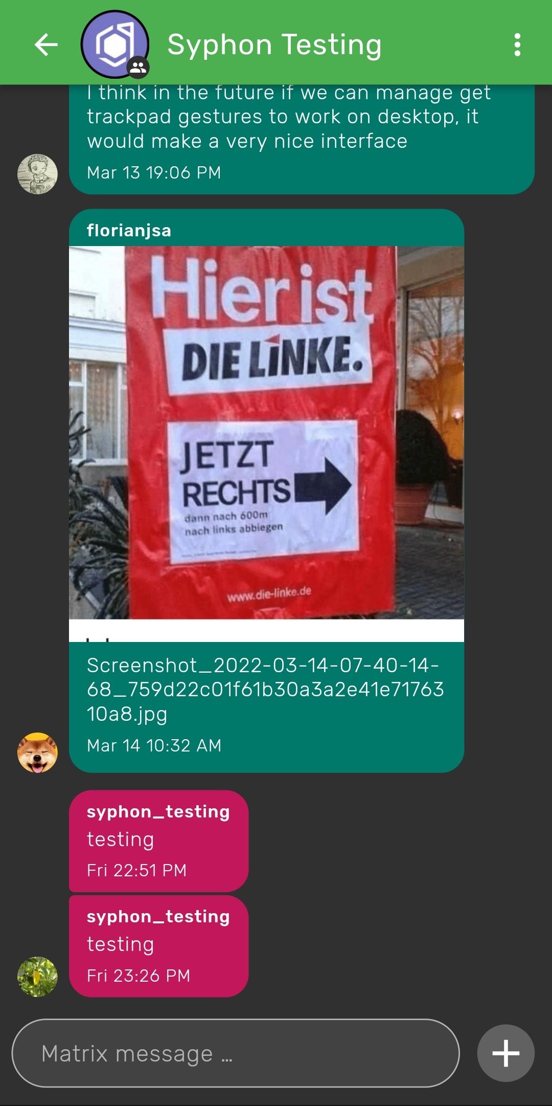 Syphon now has a core team, consisting of @ereio:matrix.org (creator of Syphon), @ed:geraghty.london, @dnisbetjones:mozilla.org, and @0x1a8510f2:0x1a8510f2.space (me)! With some of the workload now being shared, we're hoping Syphon will grow even faster with less time needed to review and merge PRs, triage and fix bugs, evaluate and implement features and answer support requests.