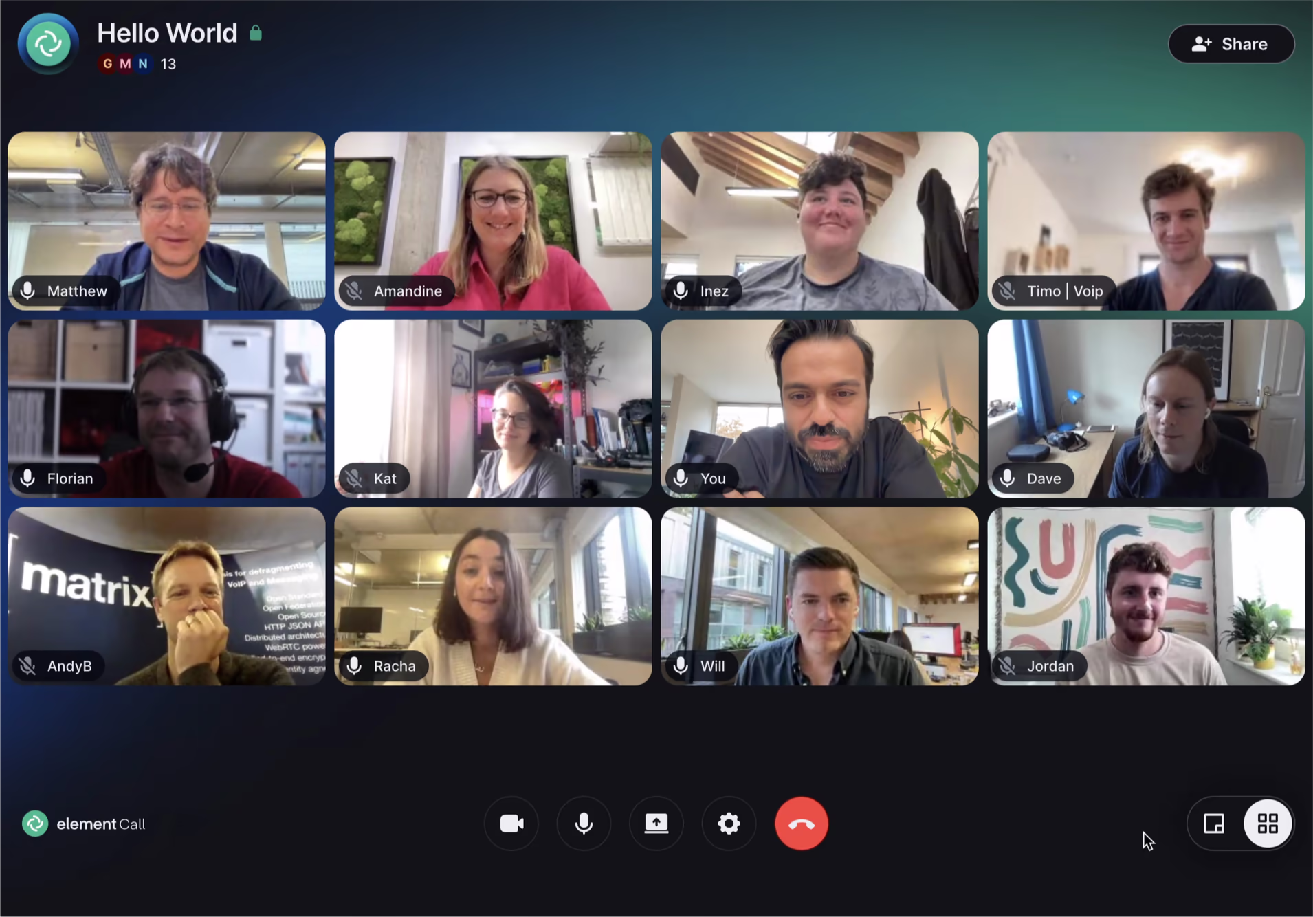 The end result was Element Call Beta 3, which is an interesting hybrid between MSC3401 and LiveKit’s existing signalling: the high-level signalling of the call (its existence, membership, duration etc) is advertised by Matrix - but the actual WebRTC signalling is handled by LiveKit, providing support for hundreds of users per call.