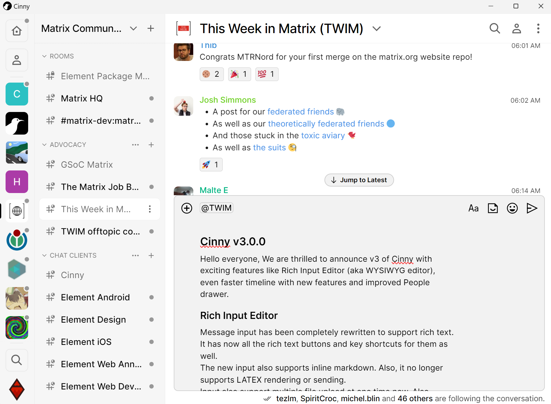 Hello everyone, We are thrilled to announce v3 of Cinny with exciting features like Rich Input Editor (aka WYSIWYG editor), even faster timeline with new features and improved People drawer. Rich Input Editor Message input has been completely rewritten to support rich text. It has now all the rich text buttons and key shortcuts for them as well. The new input also supports inline markdown. Also, it no longer supports LATEX rendering or sending. Input also support multiple file upload at one time now. Also, Emojiboard got refreshed look and combines both Emojis and Stickers and also include Sticker search. Refreshed Timeline Timeline is rewritten as part of our effort in moving the codebase to TypeScript and implementing the design system. As a result timeline scroll is 5x faster than before. It render almost all kinds of events now and has options to open various type of files right into the app itself, notably the pdf viewer. People drawer The side drawer listing people also has new features like sorting the members by Join/Left/Banned/Kicked etc as well as sorting the same alphabetically or date wise.