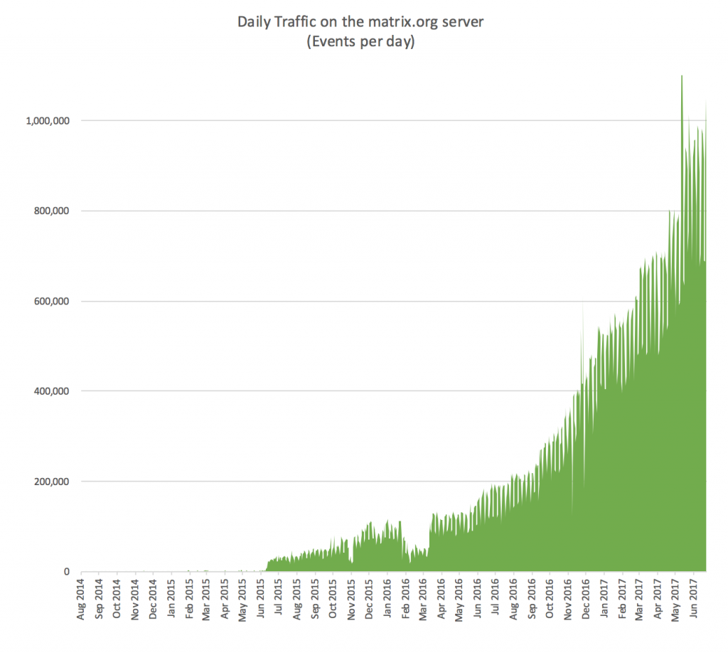 As many people know, Matrix.org development has historically been exclusively and very generously sponsored by a large multinational telecoms infrastructure company for whom most of the core team once built telco messaging apps. However, despite the project progressing better than ever (more on that later), we have just had our funding dramatically cut by >60%. [Update: as of Aug 2017 it is effectively cut entirely, with enough $ left over to cover until end of October.]