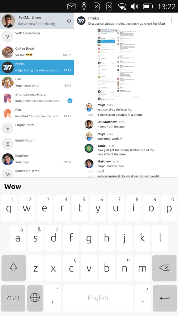 Now the next step here would obviously be to tweak the app properly to layout on a phone (bigger fonts; bigger buttons; resize the window to make room for the OSK; separate the Left Panel from the timeline view; etc) - but the point here was more to show a fully fledged native Matrix client running on a current Linux Phone environment and see how it feels. And we're happy to say that it leaves us dying to get our hands on a proper Librem5 so we can work with Nheko, uMatriks, libqmatrixclient and all the other native Matrix client projects to see how we can get the best possible native client experience running in PureOS for the phone!!
