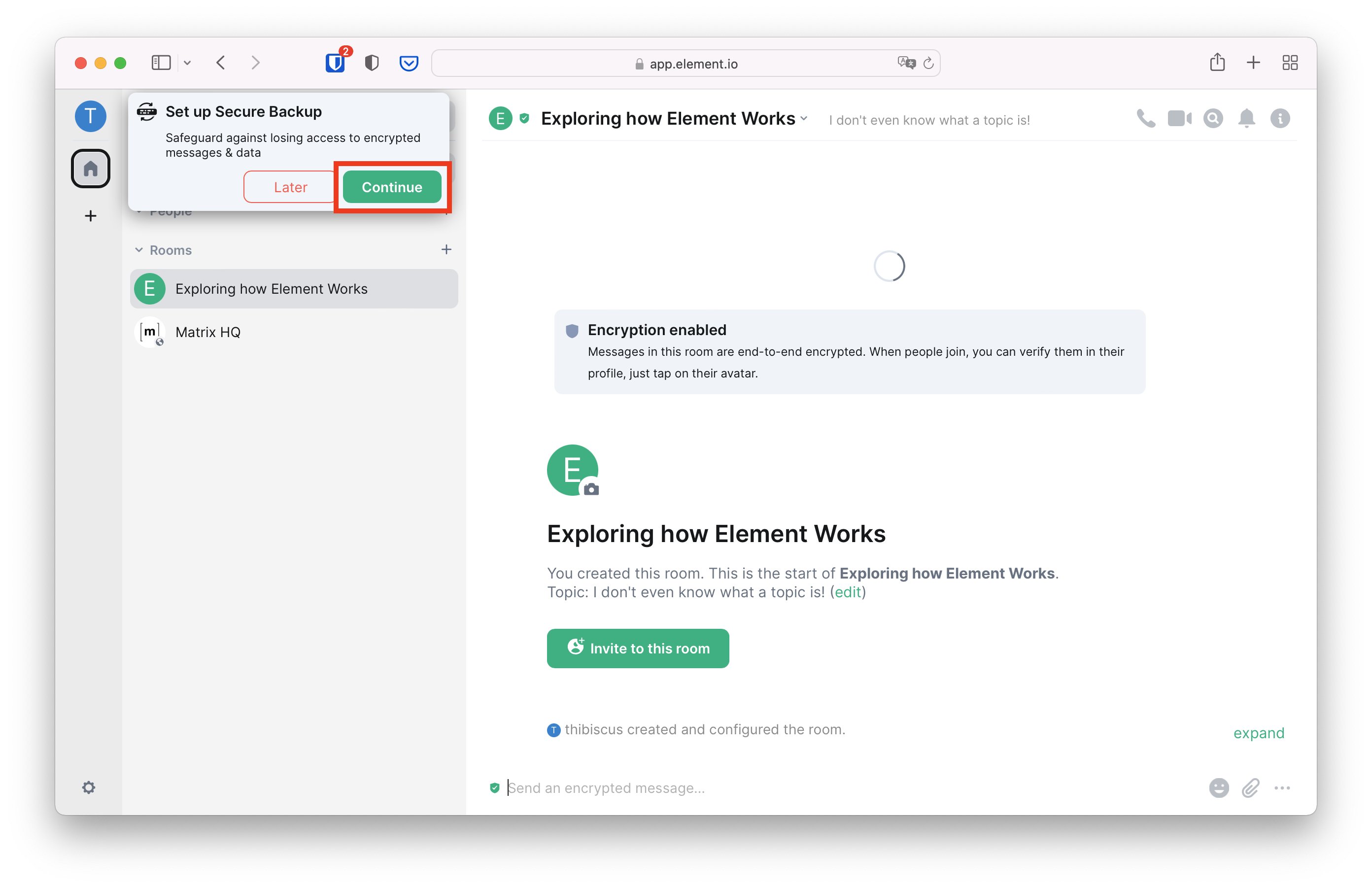 An empty private room will be created with only you inside. The room is secured using a method called "end-to-end encryption" to prevent anyone else than the members of this room from deciphering the messages. The math and cryptography behind it is quite complex, but fortunately you don't need to understand any of it.